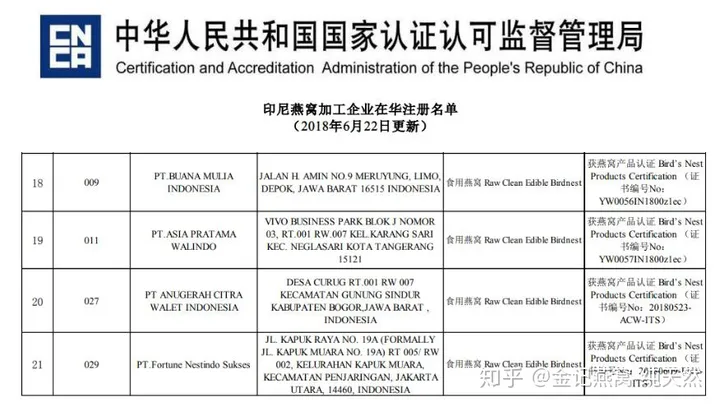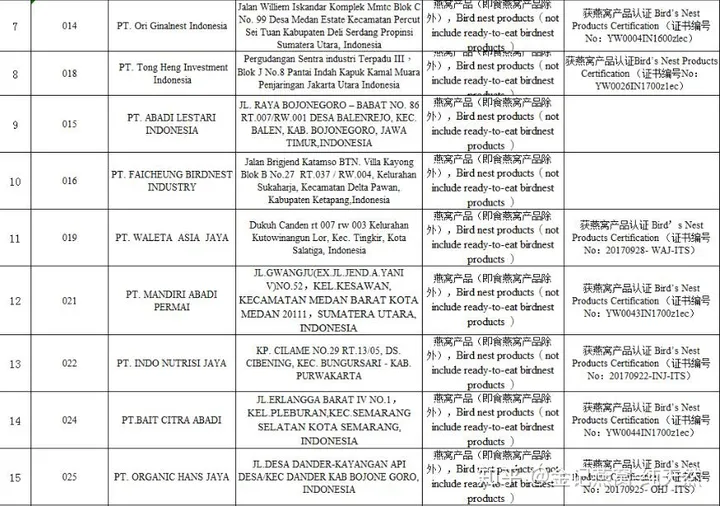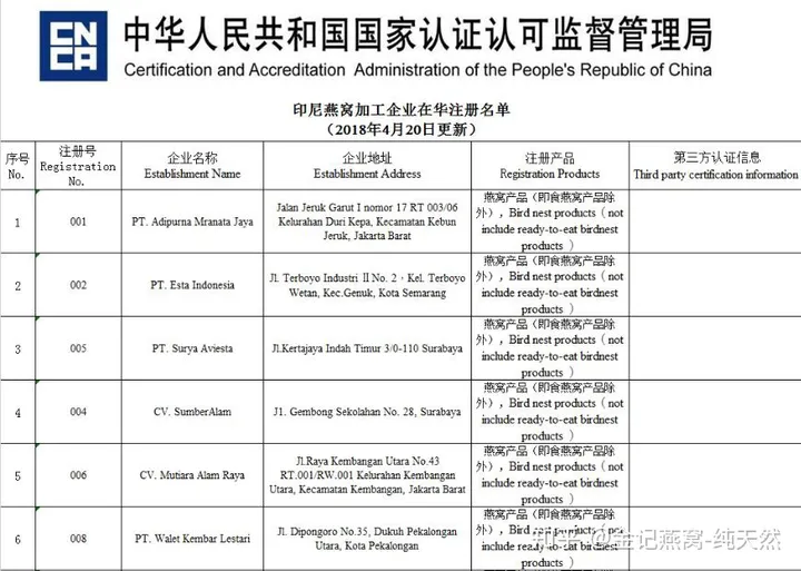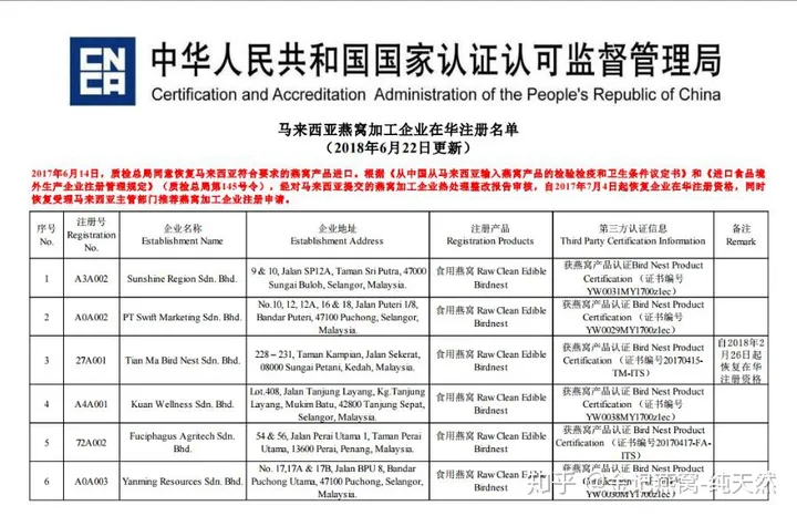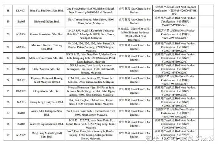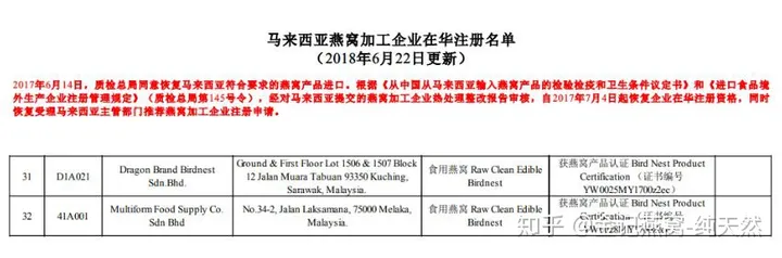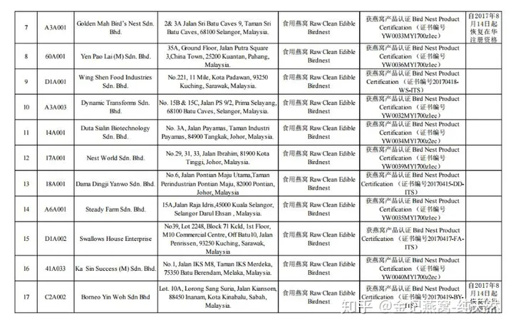 Ngoài ra, yêu cầu đối với việc sản xuất, chế biến tổ yến truy xuất nguồn gốc rất khắt khe, hiện nay ở Đông Nam Á có hàng trăm nghìn cơ sở chế biến tổ yến lớn nhỏ nhưng tổng số nhà máy đăng ký mã truy xuất nguồn gốc đã được phê duyệt. vào Trung Quốc là dưới 100. , các công ty này đều có thể đăng http://ebn.caiq.org.cn) có thể được tìm thấy (phần liệt kê~phóng to để xem):
